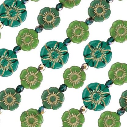 Czech Table Cut and Pressed Beads Green Hibiscus Floral Mix Strand