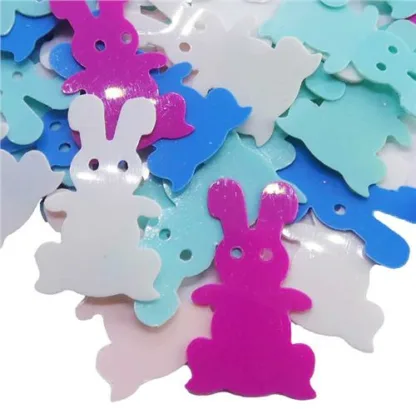 Easter Bunny Rabbit Sequins 12x20mm Assortment includes a random mix of colours: Fuchsia, Baby Pink, Blue, Baby Blue, Teal, White. Small pack includes several hundred pieces.