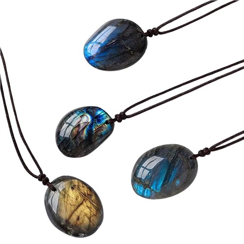 A beautiful natural labradorite oval polished pendant hung on a woven nylon cord with slide adjustment.