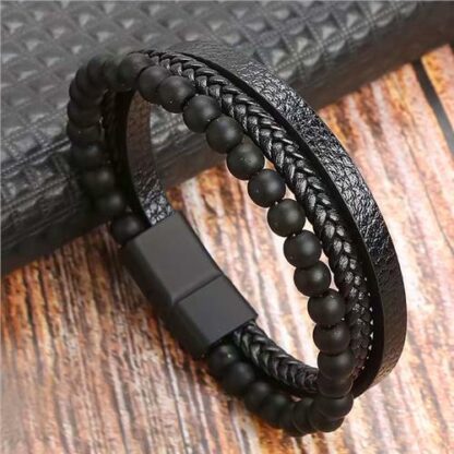 Matt Onyx braided Leather Three Layer Gemstones Bracelet 18cm
