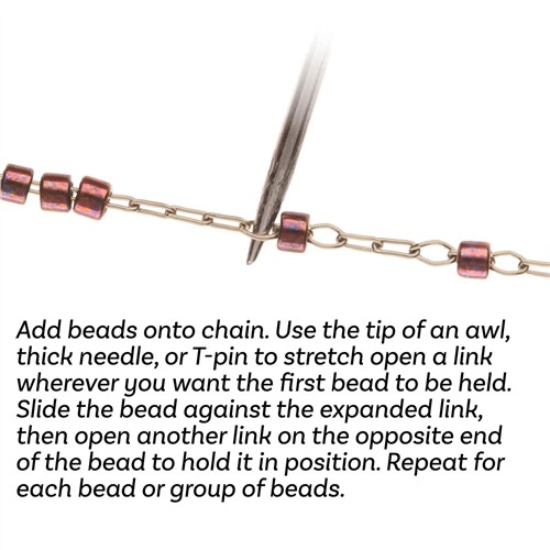 The chain is made from tiny squashed oval links that create a smooth and flexible structure. These miniature ovals can easily be adjusted using a pointed awl or T-pin. By gently opening the oval into a round shape, the ring becomes a stopper that helps keep beads positioned exactly where you want them along the chain. This simple technique allows you to space beads without needing crimps or additional findings.