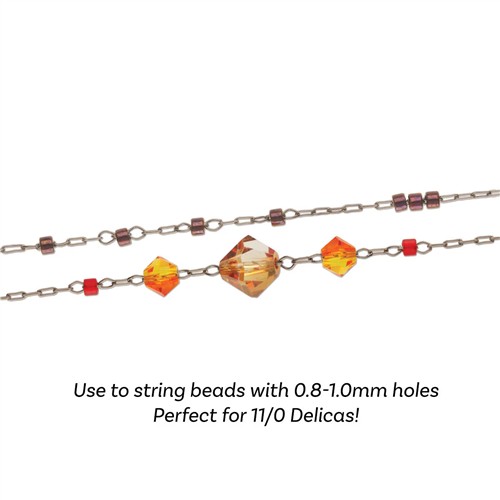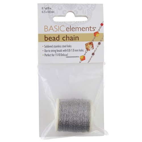 Incredibly fine yet surprisingly versatile, this stainless steel bead chain is ideal for delicate jewellery designs and detailed beadwork. With an ultra slim 0.25mm profile, the chain is fine enough to thread directly through small beads such as Preciosa bicones and even Miyuki size 11 Delica beads, allowing you to incorporate beads directly onto the chain itself.