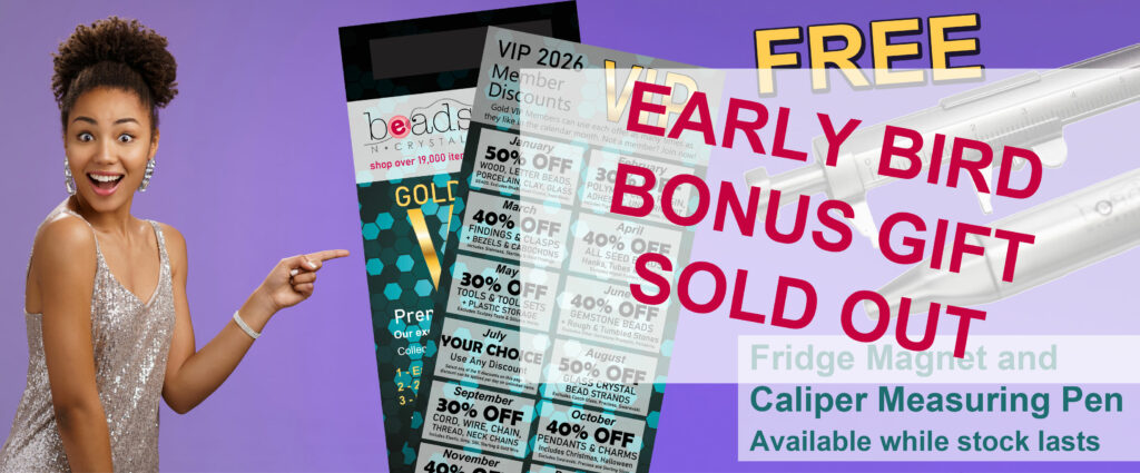 Give the gift of a year of beads and crystals at Beads N Crystals with our GOLD VIP CLUB Membership for 2026. The lucky recipient of the membership will be delighted to receive not only deep discounts on all the essential beading things they’ll need throughout the year, but also 12 free gifts – one each month. In 2025, the value of the free gifts made available to each member was a bit over $210! That’s in addition to the huge savings on monthly specials.
